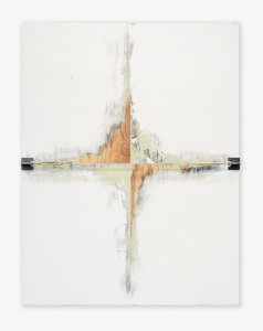 視線轉向海島另一端的日本,戰後的集體創傷催生了更具顛覆性的物質實踐。元永定正作為具體派(Gutai)的旗手,其藝術核心在於「不偽造物質」(de-objectified material)。他在《作品》(1966)中充滿有機感、如同細胞分裂般的流淌色彩,打破了界面與現實的界限,不僅展現了戰後日本對自由的極度渴望,更以一種諧謔的遊戲精神,消解了精英藝術的沈重。與這種熱烈的物質流動相對的,是原口典之對於物質本質的冷峻凝視。作為物派(Mono-ha)的靈魂人物,原口典之透過鋼鐵、工業油料等媒材,將人類行為降至最低,讓物質本身在空間中發聲。這種冷靜的呈現,實則是對日本高度工業化社會的一種抵抗,讓觀者在極致的沈默中,重新感知物與人、自然與文明之間的張力。這次展出的《牆與鋼索(三)》(2019)等其他三件作品都是原口典之在生命盡頭留下的最後作品。