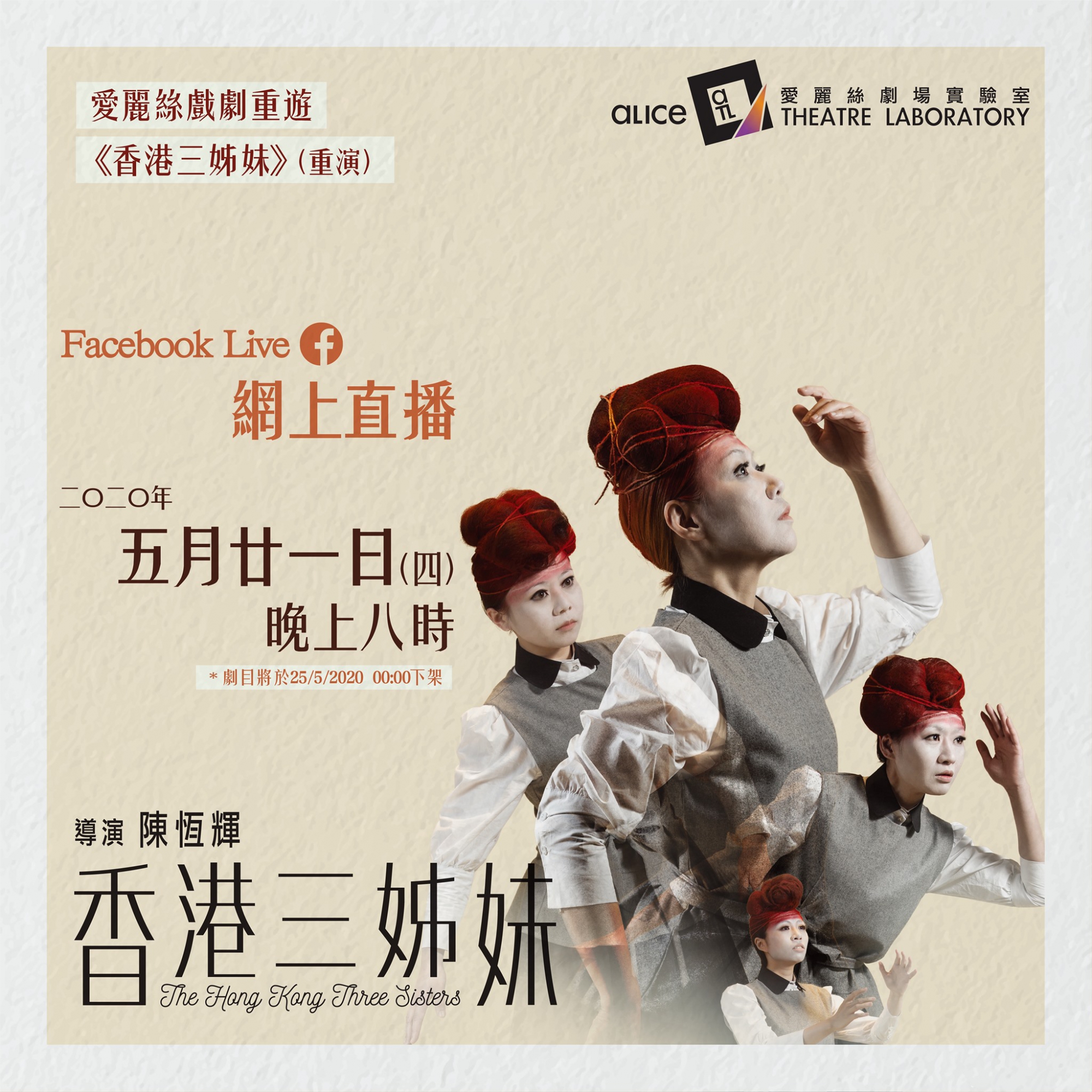 演出及製作特輯網上直播將會於2020/5/25(一) 00:00下架,尚未觀看《香港三姊妹》(2018重演)嘅劇場觀眾可以把握機會,喺星期日或之前欣賞是次演出