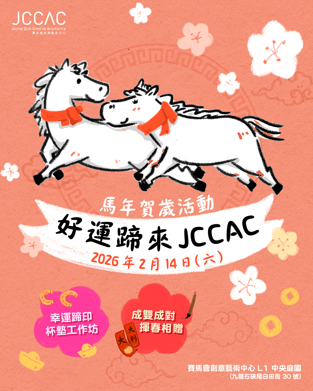 賽馬會創意藝術中心(JCCAC)為大家準備了一個洋溢新春氣息的節慶週末!春意漸濃,馬仔與馬女即將在 JCCAC 中央庭園踏出第一個蹄印!JCCAC特別於情人節推出賀歲活動,邀請你與摯愛一同參與,感受節日的甜蜜與祝福,活動包括:「幸運蹄印陶瓷杯墊工作坊」,讓你親手繪出屬於自己的幸運印記,為來年添上幸福好運;以及「成雙成對創意揮春相贈」活動,邀請JCCAC 駐村藝術家為大家即席揮毫送揮春,把滿滿喜氣與笑意帶回家,開心迎新歲!