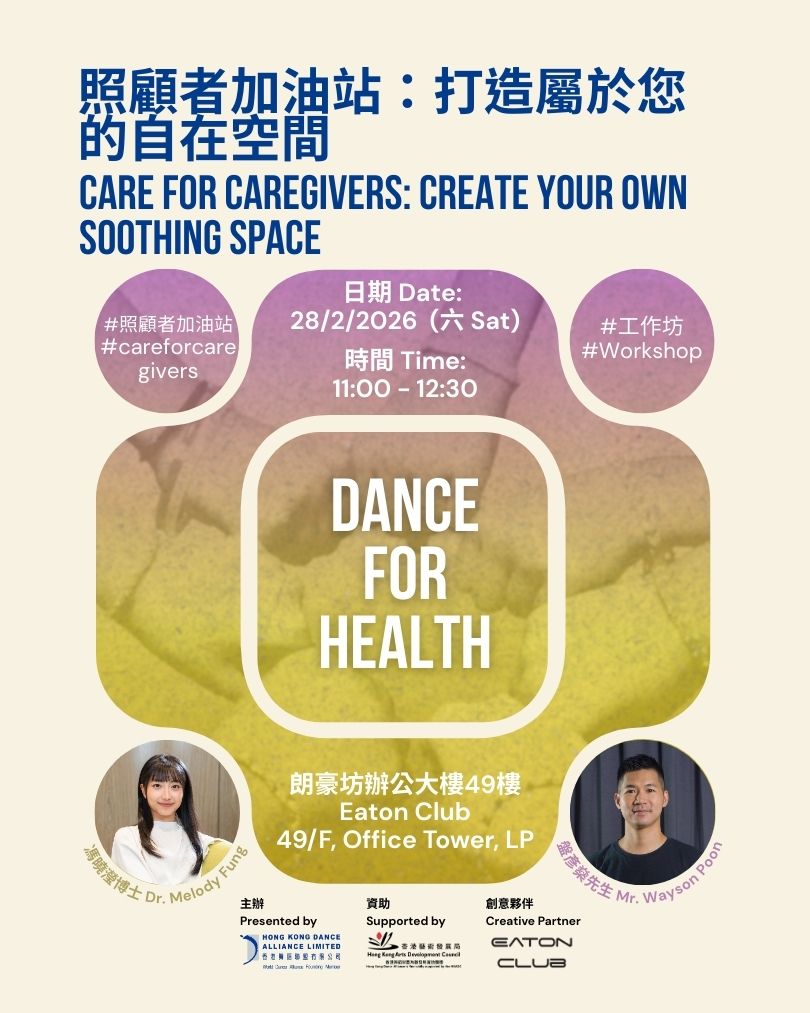 在這個結合心理學與藝術的體驗式舞動工作坊中,我們將引導你重新遇見自我,練習如何在無私付出之餘,也能溫柔對待自己。由馮曉瀅博士 ( Dr.Melody Fung ) 和盤彦燊先生 ( Wayson Poon ) 一同帶領,透過一系列富有趣味的創意舞動和正念練習,我們將一起探索如何開關一個專屬自己的療癒空間,學習善待自己和他人,感受愛與被愛。