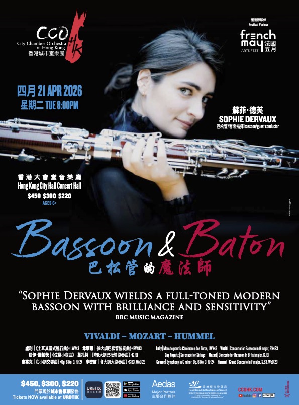 「蘇菲‧德芙以卓越才華與細膩技藝,駕馭音色渾厚的巴松管」BBC音樂雜誌巴松管,一支洋溢生命喜悅的樂器,在這場獨特音樂會中罕有擔綱主角!在法國出生的蘇菲‧德芙,現任維也納愛樂樂團巴松管首席。她將首次登上香港舞台,演奏巴洛克與古典時期最炫技的巴松管協奏曲,帶來振奮人心的演出。她亦將親自執棒指揮香港城市室樂團,呈獻盧利、高塞克與居伊‧羅帕茨的法國佳作。