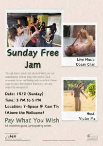 「多空間」將會在舞蹈中心舉行即興Jam活動,邀請音樂家進行即興音樂,在現場音樂及主持人帶領之下,參與者能夠透過舞蹈和身體進行交流,無需過多言語,每個動作傳遞真摯感受。活動開放給不同界別人士參與,在自由和尊重的氛圍中,享受舞蹈的魅力!