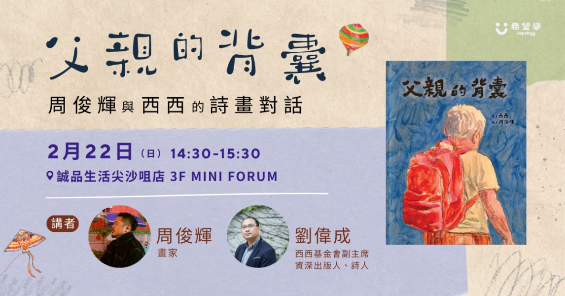 西西著名詩作《父親的背囊》以天馬行空的想像力深刻地描繪了父親的愛與重擔。畫家周俊輝以簡潔傳神的筆觸、夢幻多變的色彩,以及具電影蒙太奇風格的跳接畫面,呈現出詩作的美麗與哀愁。本活動邀來周俊輝分享其創作歷程,與西西基金會副主席、資深出版人、詩人劉偉成一起解讀西西詩作。