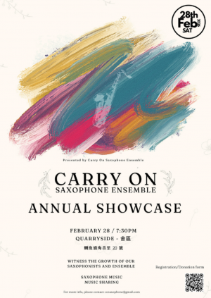 「Carry On計劃,起源於中文大學崇基校友會,正邁入第二年,新的成員與舊的成員共同成長。在首年中,在大家的支持下,我們成功招募了10名新成員並舉辦了三場音樂會,吸引了600位觀眾。今年,我們還邀請了現任中文大學音樂系的學生加入我們,共同創作音樂。當晚將展現薩克管獨奏及合奏的表演,曲目涵蓋古典音樂和流行音樂。我們誠邀大家來參加這場音樂會,享受美好夜晚,如有興趣加入我們的計劃,隨時與我們交流!」