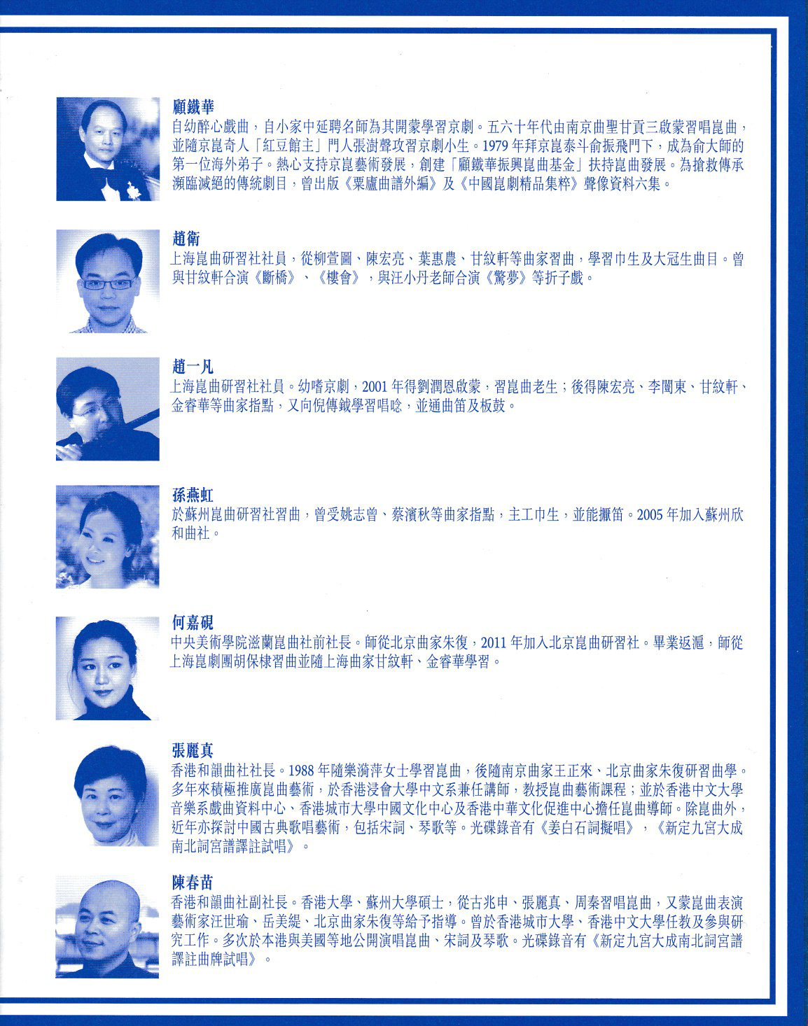 崑曲以其獨特的歷史發展,幾百年來通過文人士大夫階層的參與,積累了豐富的演出劇本。如高明寫《琵琶記》、湯顯祖寫《牡丹亭》,洪昇寫《長生殿》,紛紛記下了明清時期崑曲的輝煌,崑曲藝術因文人的參與而大大提高了唱、演的藝術水平和品位。崑曲清唱先於劇唱,崑腔改良而成為風靡上層社會的「水磨」雅曲,即得力於明中葉魏良輔、梁辰魚等一批文人雅士,並於明清兩代留下了豐富的曲唱理論。文人階層以清曲演唱的形式輾轉相傳,重於曲唱的研究,追求文字與音樂的完美結合,探討文字的聲韻,樂音的協調。因此崑曲藝術流傳至今,不但見諸於舞台之上的演出,清曲演唱亦十分蓬勃。是次戲曲節主辦「崑曲清唱藝術系列」,以兩場崑曲清唱會及三場崑曲論壇,讓觀眾從不同角度了解崑曲藝術。