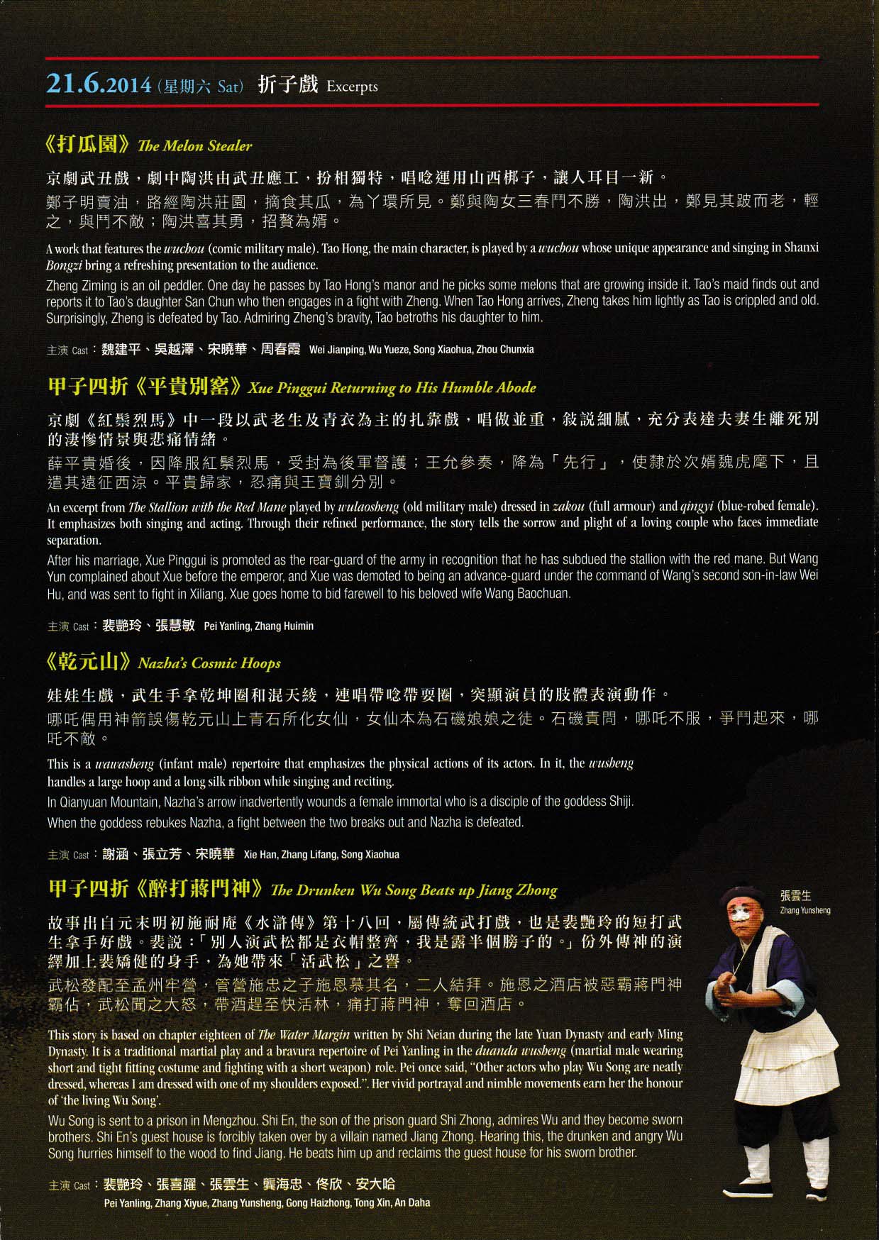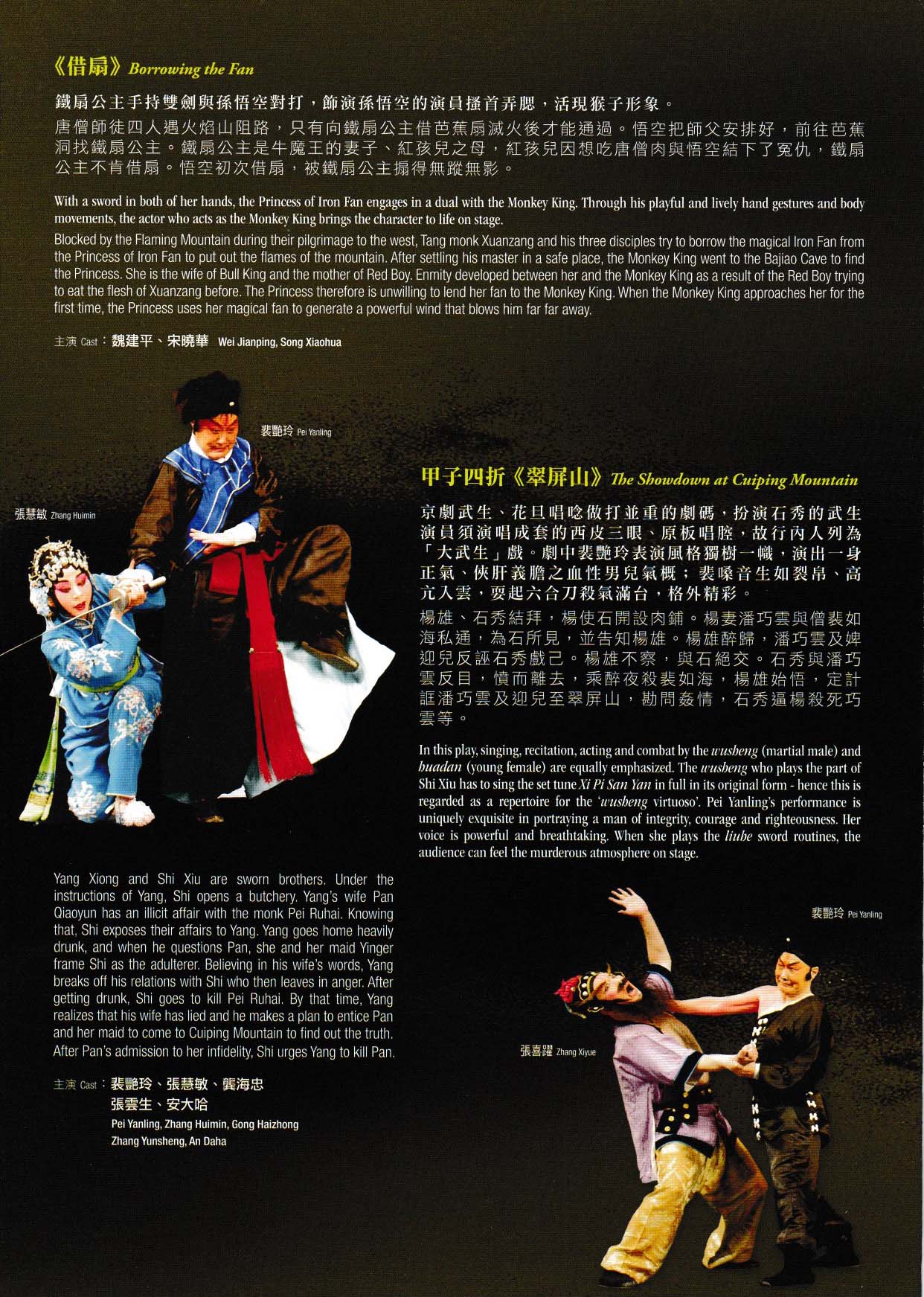 裴艷玲親身示範崑劇武生戲《夜奔》、《探莊》、《乾元山》、《蜈蚣嶺》中的四段【新水令】,解說林冲、石秀、哪吒、武松四個角色的獨特之處,及示範京劇唱功戲《洪洋洞》。