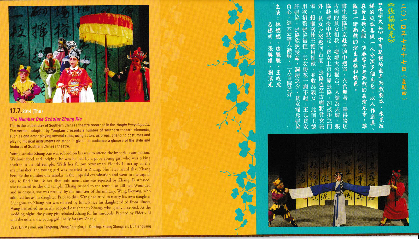 永嘉崑劇,又名溫州崑劇,流行於浙江東南沿海地區。温州是南戲的發源地,又是海鹽腔的流行區域,因此永嘉崑劇保留古南戲的格局,其聲腔的某些特點也與「體局靜好」的海鹽腔風格相近。永崑表演富濃郁生活氣息,為「草崑」代表之一,源用崑曲曲牌腔格,語言方言化,音樂亦較通俗,不作「水磨」,與細膩的「正崑」有著明顯分野。永崑上世紀卻幾近滅絕,浙江永嘉崑劇團為現存唯一專業於永崑藝術的劇團。宋元南戲代表作《張協狀元》,保留一人分演多角的格局,判官和小鬼既是旁觀者,又是評論者,更是張協內心鬥爭的外化象徵,團圓喜劇同時揭露古代女性意志與命運相背的悲劇意味。老藝術家林媚媚、黃宗生、呂德明及一眾優秀演員將主演多齣經典折子戲,呈現樸實真摯的永崑氣息