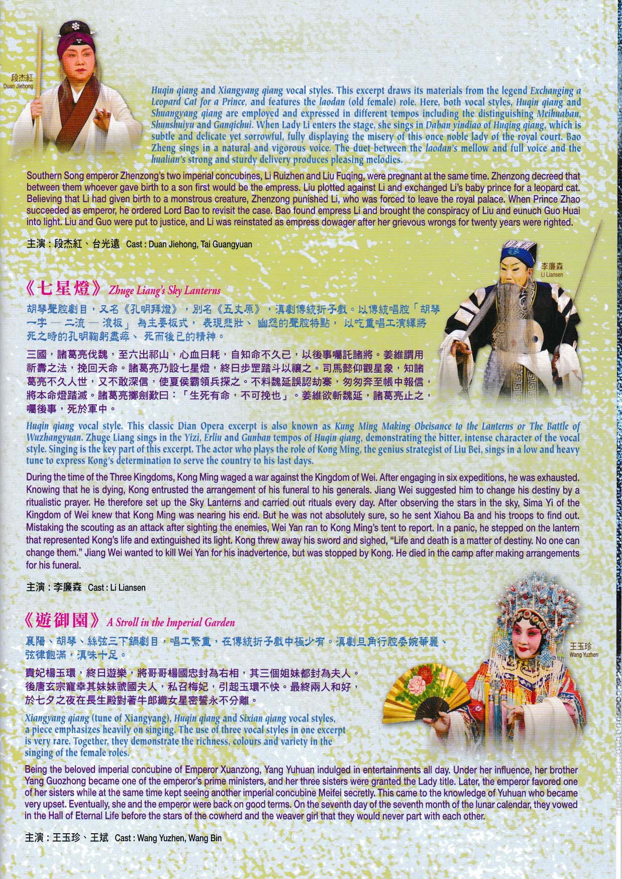 滇劇是雲南主要地方劇種,約有二百多年歷史,2008年列入國家級非物質文化遺產名錄。其演出語言以昆明官話為主,自秦腔、徽調及楚調傳入雲南後,發展成絲弦、胡琴、襄陽三大聲腔,復吸收當地多民族藝術,形成獨特板式和唱法。絲弦腔有「甜品」、「苦品」之分,既具秦腔的激越,又帶雲南民歌的歡快,人稱「滇梆子」;胡琴腔源於與二黃同源的徽調石牌腔,但沒有「原板」;襄陽腔則由漢劇襄河派西皮調演化而來,帶幽默愉快之感。音樂伴奏絲弦腔以鋸琴為主,胡琴、襄陽則以胡琴為主。《京娘送兄》、《闖宮》、《鼓滾劉封》、《牛皋扯旨》均為滇劇代表性傳統劇目,而《楊門女將•出征》為三下鍋劇目,即三種曲調兼唱,地方色彩濃郁。《七星燈》唱工吃重,孔明將死之時鞠躬盡瘁,演者低沉的嗓音必須越唱越衰,及至身衰心不衰,聞之悵然若失。