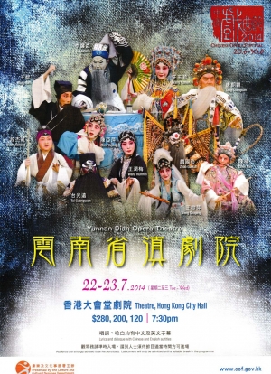 滇劇是雲南主要地方劇種,約有二百多年歷史,2008年列入國家級非物質文化遺產名錄。其演出語言以昆明官話為主,自秦腔、徽調及楚調傳入雲南後,發展成絲弦、胡琴、襄陽三大聲腔,復吸收當地多民族藝術,形成獨特板式和唱法。絲弦腔有「甜品」、「苦品」之分,既具秦腔的激越,又帶雲南民歌的歡快,人稱「滇梆子」;胡琴腔源於與二黃同源的徽調石牌腔,但沒有「原板」;襄陽腔則由漢劇襄河派西皮調演化而來,帶幽默愉快之感。音樂伴奏絲弦腔以鋸琴為主,胡琴、襄陽則以胡琴為主。《京娘送兄》、《闖宮》、《鼓滾劉封》、《牛皋扯旨》均為滇劇代表性傳統劇目,而《楊門女將•出征》為三下鍋劇目,即三種曲調兼唱,地方色彩濃郁。《七星燈》唱工吃重,孔明將死之時鞠躬盡瘁,演者低沉的嗓音必須越唱越衰,及至身衰心不衰,聞之悵然若失。