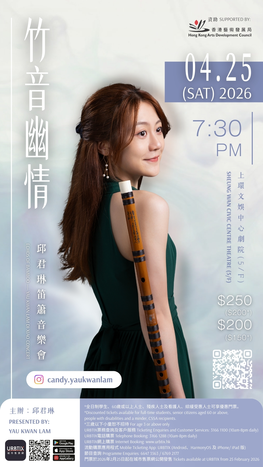 竹音幽情——邱君琳笛簫音樂會,精選以「情」為主題的笛簫樂曲作品,展現古今不同國家、地區和風格的竹管音樂精粹。