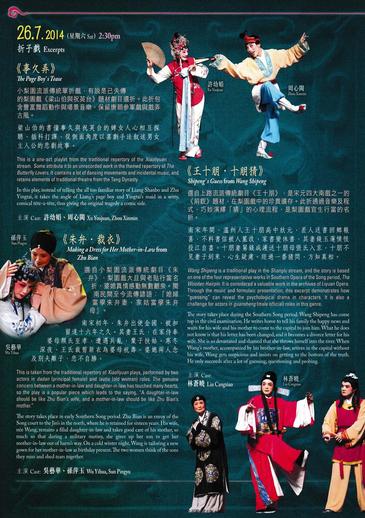 梨園戲以閩南語泉州腔演唱,起源於福建泉州,是中國現存最古老的劇種之一,可追溯歷史達八百年之久。梨園戲音樂屬曲牌聯綴體,風格古樸,保存了不少唐宋大曲、法曲與曲牌,其司鼓樂器南鼓 (俗稱壓腳鼓) 尤具特色,樂師須運用脚跟的壓力變化,敲打出千變萬化的鼓點節奏。為細緻欣賞梨園戲音樂,戲曲節特别安排一場梨園戲音樂會,重點展示這古老劇種音樂藝術的各種精妙。梨園戲劇目分爲「上路」、「下南」、「小梨園」三大流派,各有專屬傳統劇目。「上路」風格古樸蒼勁,保留許多宋元時期的南戲古劇目,如《王十朋》;「下南」大多搬演民間故事,具生活氣息,如《劉秀•大歸》;「小梨園」藝術細膩精緻,保存了明初南戲劇目,如《陳三五娘》和《呂蒙正》等。梨園戲角色分七個行當,稱為「七子班」,其獨特的表演程式俗稱「十八步科母」,精雕細琢,規範極為嚴格,尤以旦角表演最爲著名,其中又以「二架旦」行當最具代表性,兼具了花旦、青衣和小旦的表演特色。著名梨園戲表演藝術家曾靜萍為優秀「二架旦」演員,率領劇團骨幹林賦賦、吳藝華、李紅、張純吉、林蒼曉來港演出,將是一睹古雅梨園戲藝術的最佳時機。