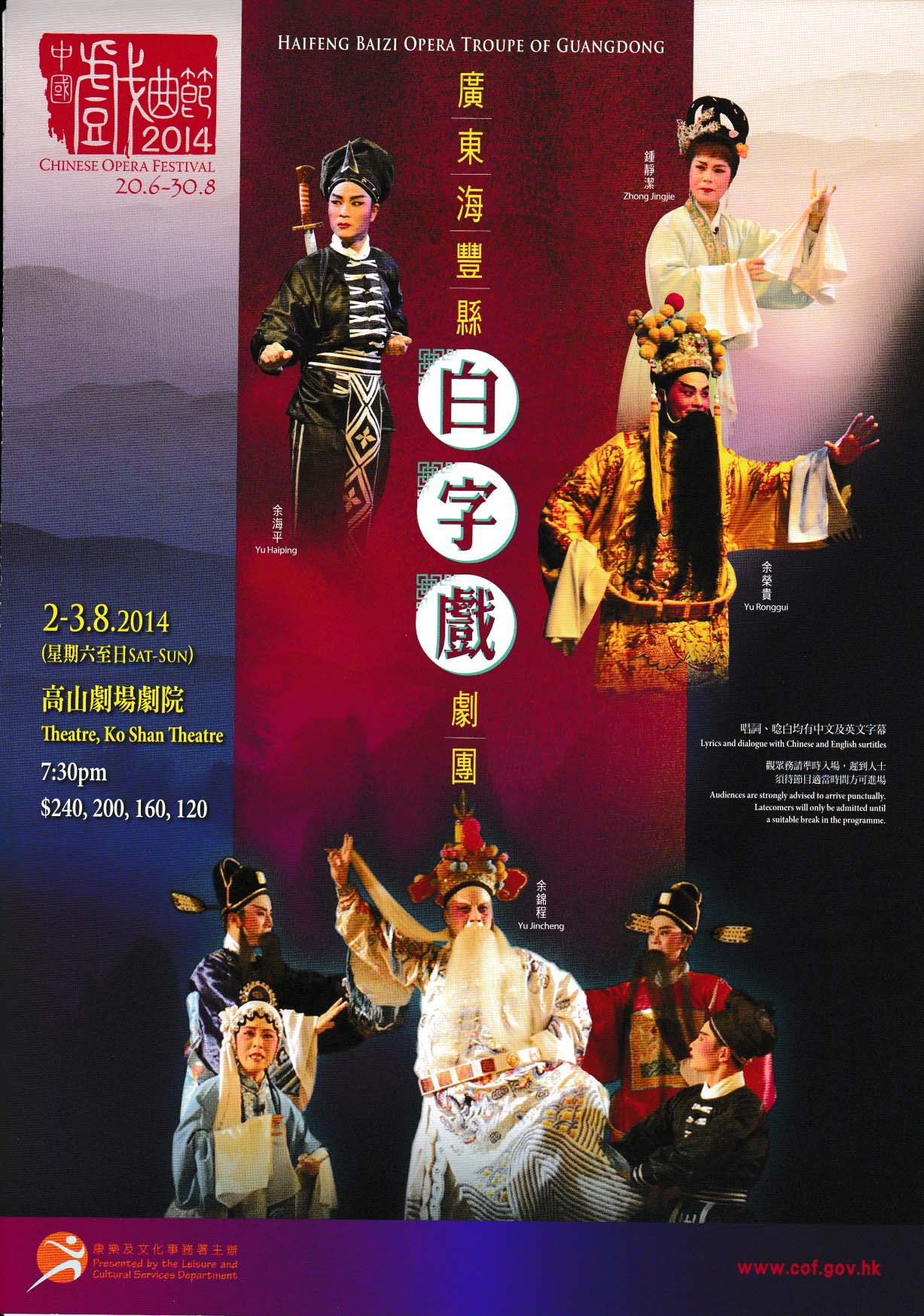 白字戲,又稱「海陸豐白字」、「南下白字」,是盛行於惠海陸、潮汕和閩南語系地域的劇種,屬首批國家級非物質文化遺產保護項目。其唱唸不用中州官話(正字),而用當地方言「白字」(福佬話)演唱,具濃厚地方韻味。白字戲擅長於文戲,唱腔以曲牌聯套體為主,腔調柔美,常用獨特的「啊咿噯」作拉腔,有聯曲、滾唱、一唱眾和等特點。白字戲的伴奏音樂、間奏音樂豐富,有數以百計的伴奏弦詩和牌子,以二弦或嗩吶為主奏樂器,作為「過門」或配合各「場口」、「科介」,加強戲劇表現力和感染力。腳色分生、旦、丑、淨、公、婆、貼七個行當,與南戲相同,表演嚴而不僵。廣東海豐縣白字戲劇團是全國唯一國辦的白字戲演出團體,一九五二年成立以來演出屢獲獎項,藝術風格細緻。這次選演大戲《金葉菊》為劇團代表劇目,充份展示白字戲唱唸及音樂特色。折子戲《放走曾榮•放走》為明代傳奇《鬧嚴府》之續編;《白羅衣》及《梁山伯與祝英台》等折子均為白字戲優秀傳統劇目。