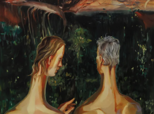 Luca Sára Rózsa (b. 1990, Hungary) analyses the complex relationship between mankind and his environment. Her figures, taken from the Bible and mythology, are often shown in a natural setting in line with the representational portraiture of the Renaissance and the baroque. Placed within a utopian, dreamlike landscape of solitude, her figures are forced to face their own anxieties stemming from the eternity of the world. As the artist describes it, "The figures in my paintings are mammals who have eaten from the Tree of Knowledge and have been expelled from Paradise. They are fully exposed to their fate, facing it either with resignation or hope."