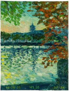 林偉而更於不同時節重訪同一視點,在構圖的穩定性與色彩、調性、情緒的變化。 湖光山色與人文建築交融互映,呈現天人合一的美學。藝術家對花卉園林的鍾情,承繼了其朝聖莫內吉維尼等藝術聖地的美學體悟,追求「流動精神」(Flowing Spirit),捕捉西湖的氣韻、時空和氛圍。此概念橫跨東西方藝術傳統,具有普世的美學價值。西湖自古以來便是文人墨客的靈感源泉,千年文脈在藝術家的每一筆觸中得以延續與重構。