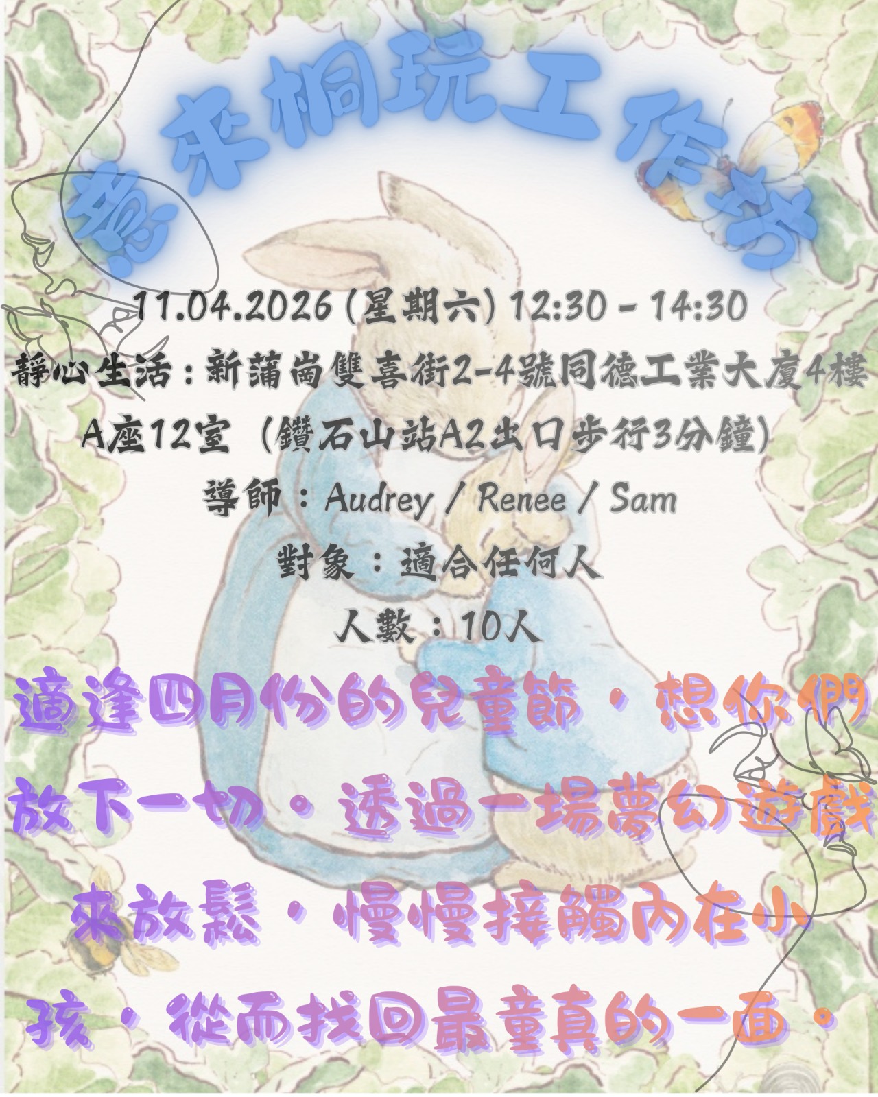 適逢四月份的兒童節,想你們放下一切。透過一場夢幻遊戲來放鬆,慢慢接觸內在小孩,從而找回最童真的一面。