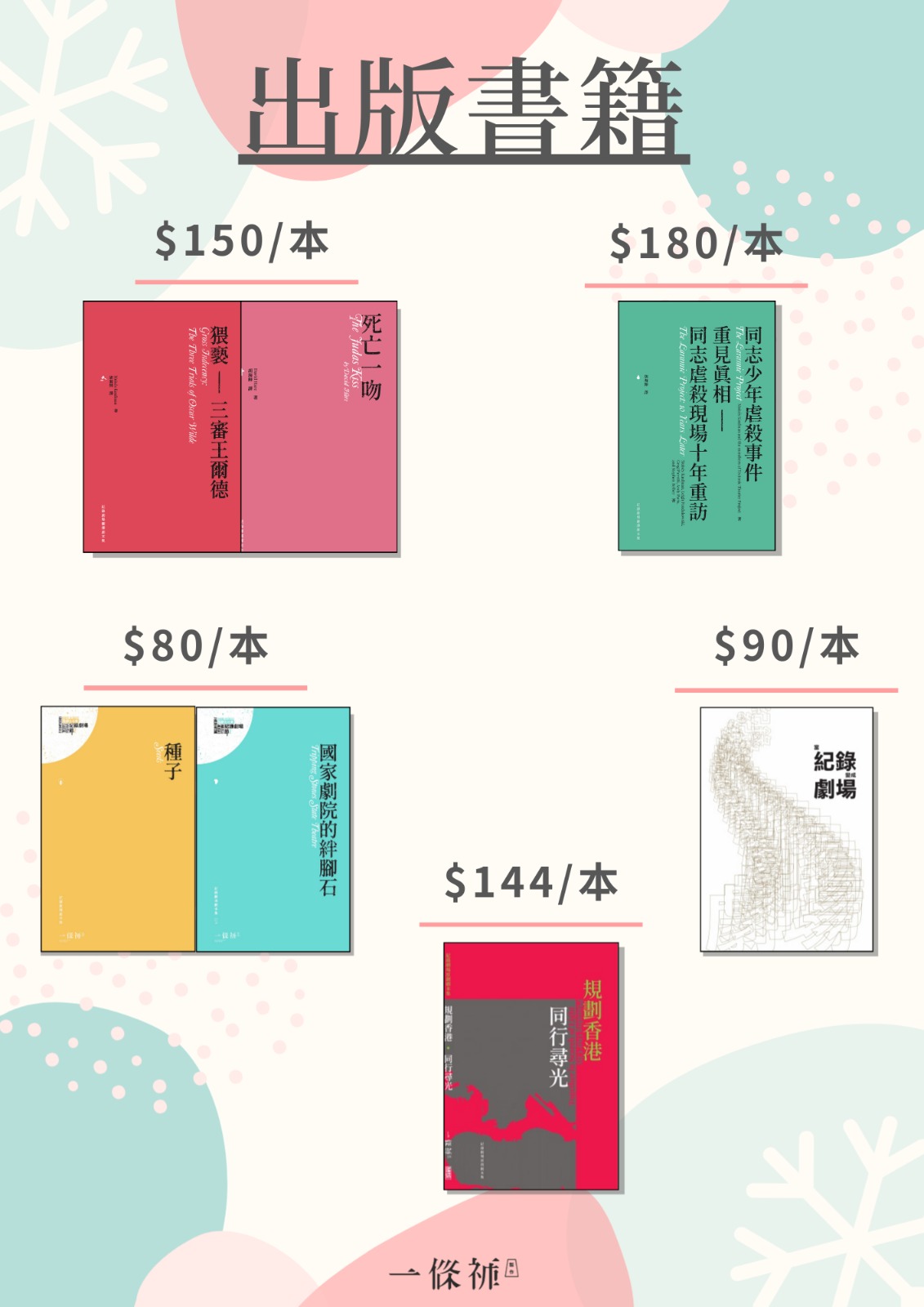 包羅萬有!一條褲製作出版曾演出/演讀的劇本、討論華文紀錄劇場實踐的書籍,及製作紀念品,歡迎選購。