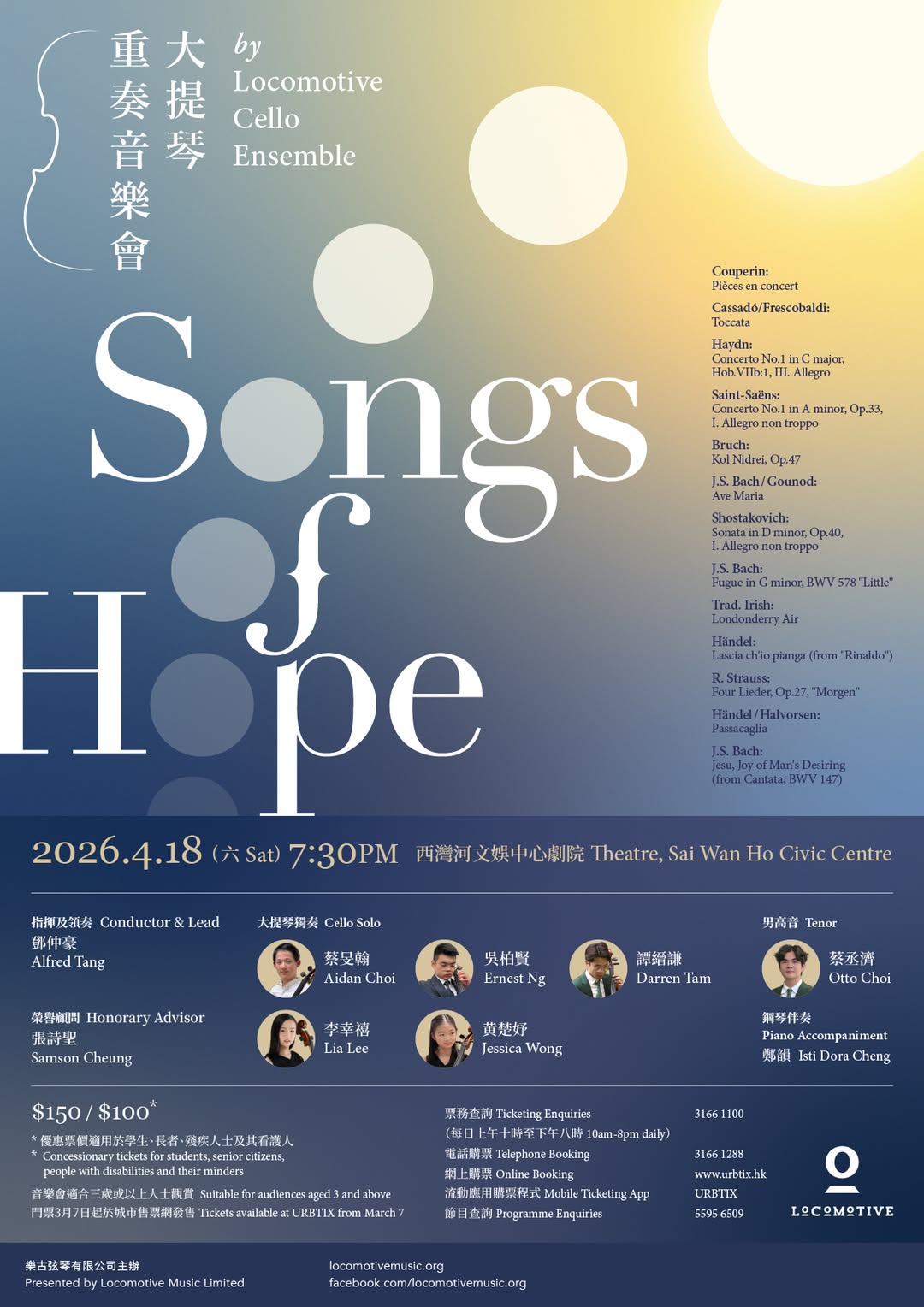 樂古大提琴重奏團以「柏林愛樂十二支大提琴」為楷模,由鄧仲豪擔任駐團指揮,按各聲部團員的特性編配樂曲,以達到最佳合奏效果。團員不分長幼,都因熱愛大提琴重奏而全年不間斷排練。本團創立近九年以來第六個音樂會 "Songs of Hope",節目包括由少年團員擔任獨奏的大提琴協奏曲樂章和獨奏小品,及由不同組合演出之大提琴重奏樂曲。是次音樂會更邀得嶄露頭角的少年男高音蔡丞濟與本團合作,為樂迷獻上由大提琴重奏團伴奏之聲樂作品。