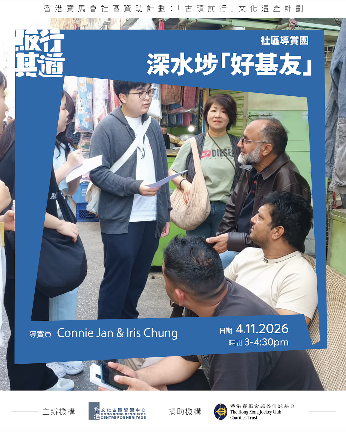 香港賽馬會社區資助計劃︰「古蹟前行」文化遺產計劃──本計劃由香港賽馬會慈善信託基金捐助,香港文化古蹟資源中心主辦,透過遊走社區,尋訪大埔和深水埗的古蹟建築、非物質文化遺產、工藝,通過跨世代和跨界別合作,蒐集口述歷史和日常生活故事,重現社區魅力。