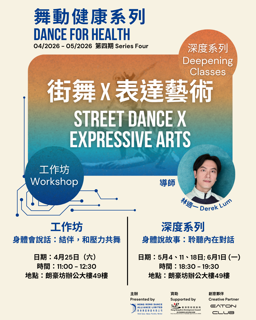 香港舞蹈聯盟致力於推動舞蹈界發展,並探索舞蹈對社會不同群體的幫助。我們與創意夥伴Eaton Club 合作推出六期《舞動健康》系列,展示舞蹈在維繫身心健康的功用。在朗豪坊的工作坊中,這個系列將結合科學、運動和舞蹈實踐,促進跨學科對話。
