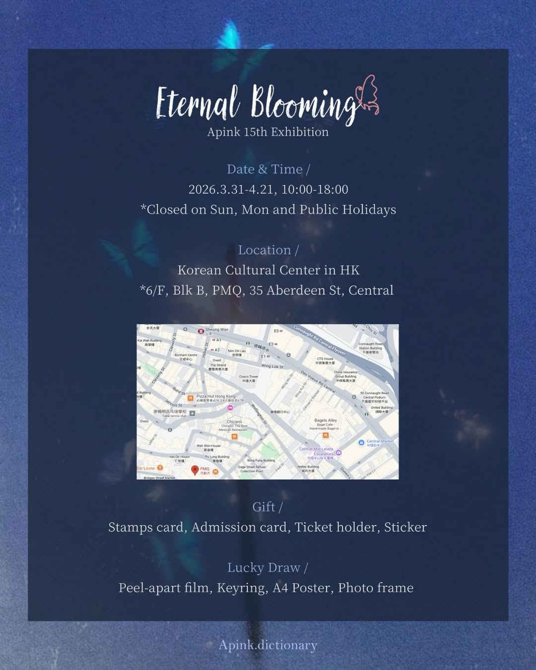 𝐄𝐭𝐞𝐫𝐧𝐚𝐥 𝐁𝐥𝐨𝐨𝐦𝐢𝐧𝐠為慶祝Apink出道15週年,字典將於駐香港韓國文化院舉行展覽,屆時將會展出Apink出道15年來活動相片及週邊,更設有互動打卡位置,以及SNS認證活動。希望大家一同共度歡樂的時光 !!讓我們透過展覽,見證 Apink 15年的成長、回憶與愛。