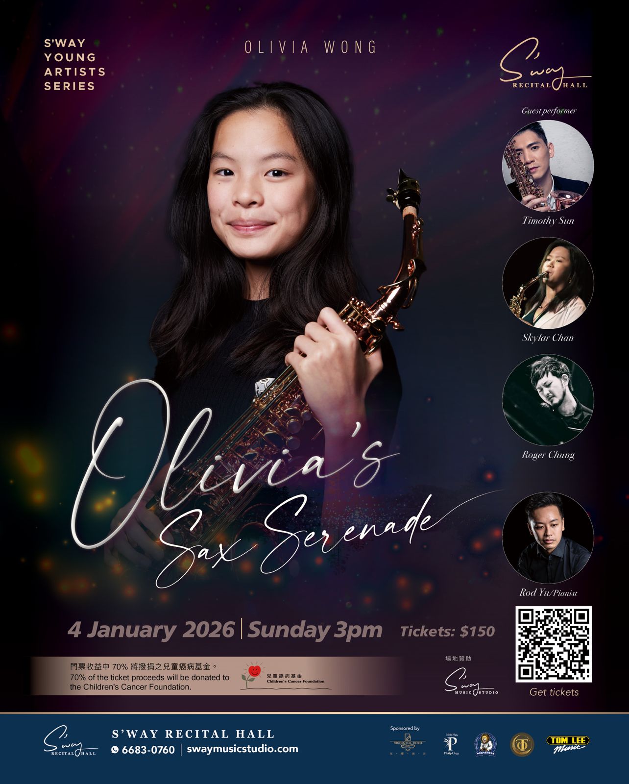 來自香港、現於英國升學的15歲色士風演奏家黃靜汶(Olivia Wong )誠摯邀請您參與一個多元風格的音樂盛宴,由她和她的老師為你帶來一個充滿魅力的下午。