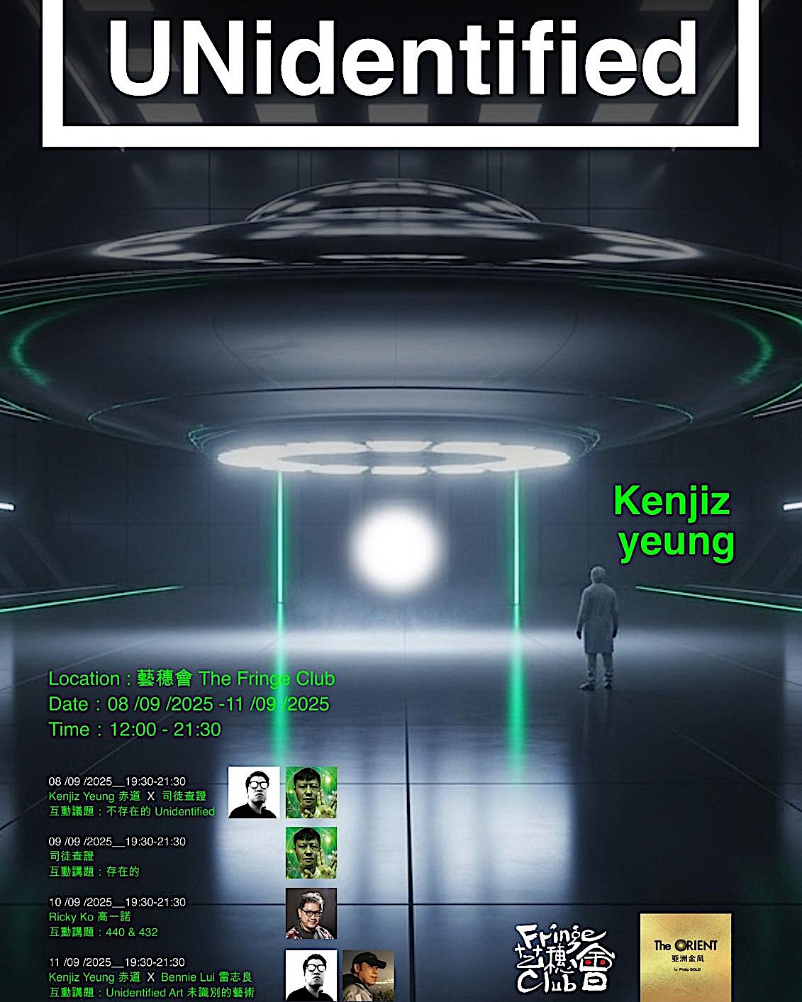 《來歷不明》(UNIDENTIFIED 2025) 是一場於2025年9月在香港藝穗會地下劇場舉行的元宇宙藝術展,由數碼藝術家Kenjiz Yeung主創,聚焦未知起源的現象、夢境與跨時空文化交流。展覽免費入場,結合數碼藝術、互動裝置、聲音實驗及系列講座,邀請觀眾透過AI與3D技術體驗平行維度與神秘頻率。