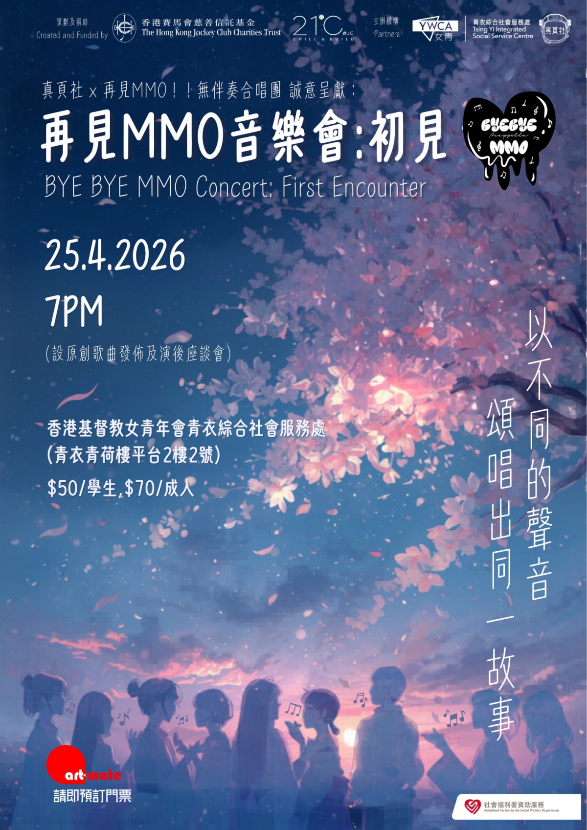 再見MMO無伴奏合唱團由2024開始成立,我們一路上逐步學習,學不同的聲部、不同的節奏…慢慢踏上過不同大小的舞台,讓我們更認識屬於我們的聲音。我們很珍惜一起學習的體驗、感受和滿足感。2025年,我們創作了第一首屬於我們的主題曲 - 再見MMO。來到2026年,我們嘗試一次的音樂會,分享我們的故事和我們的聲音。