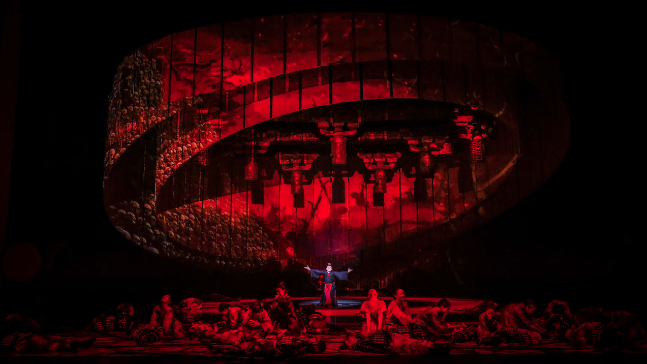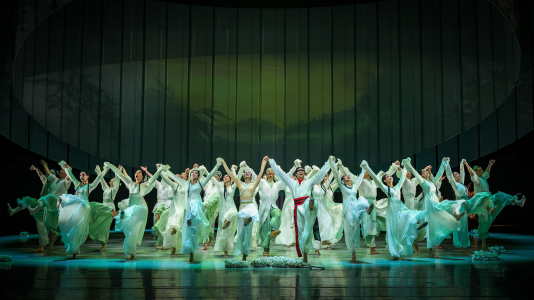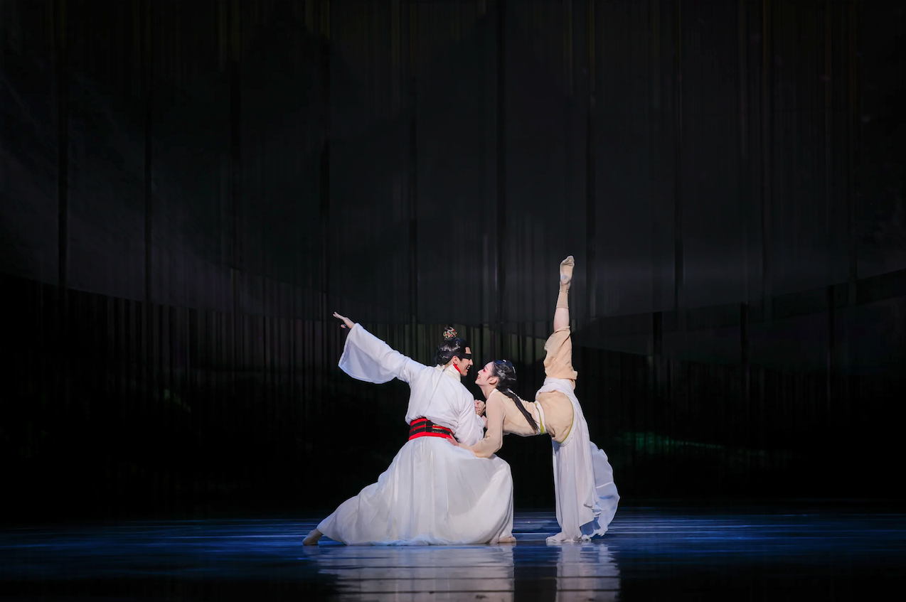 以舞為筆,以樂為墨─ 原創舞劇《樂和長歌》好比一闕穿越千年的楚韻長歌,在戰國風雲中綻放禮樂之光。和國新君和成繼位,樂國遣使獻上編鐘,欲止戈休戰,孰料一夜之間,刺客來襲。和國大將戈啟力主復仇,令和成陷入「戰」抑「和」、「劍」抑「鐘」的兩難抉擇。出征祭典上,樂伎希音挺身而出,揭開陰謀。鐘鳴九霄,樂和天地。台上重現從湖北省博物館一比一復刻的編鐘、鐘磬、虎座鳳架雙面鼓等古典樂器,營造楚地禮樂氛圍。