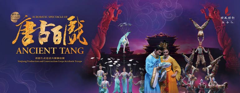 大唐盛世,舞樂爭輝!「百戲」融匯禮樂、樂府民歌與西域樂舞,滿載各族風情。《唐古百戲》帶您穿越千年,親歷唐玄宗愛女萬春公主醉心鑽研的箜篌雅韻與舞藝翩躚,並拜師名家謝阿蠻門下,承襲其技。置身皇帝壽宴的慶典,與各國使節共享絕妙百戲,體驗舞中幡、轉碟、高車踢碗、傘上行車等經典絕技。萬春公主與負責外交的四方館官員楊朏因切磋藝術而成佳偶,並創辦「童藝班」傳承中華百戲。是次演出將為香港觀眾獻上一場歎為觀止的雜技盛宴。