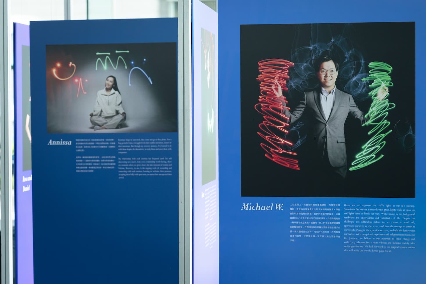 1.「光影塗鴉」攝影作品: 由歷屆心聆大使共同創作的作品,將個人的情感與經歷轉化為光影、色彩與律動。再配合文字敘述,參觀者可以感受精神健康挑戰親歷者的故事,更了解自己與彼此。