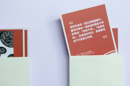 2. 心靈寄語卡: 集合 20 款由不同心聆大使創作的心靈寄語卡,包含他們的真摯寄語、藝術創作、繪畫或音訊。參觀者可以從中挑選引起自己共鳴的小卡,將這些溫柔又充滿力量的提醒帶回家或與他人分享。