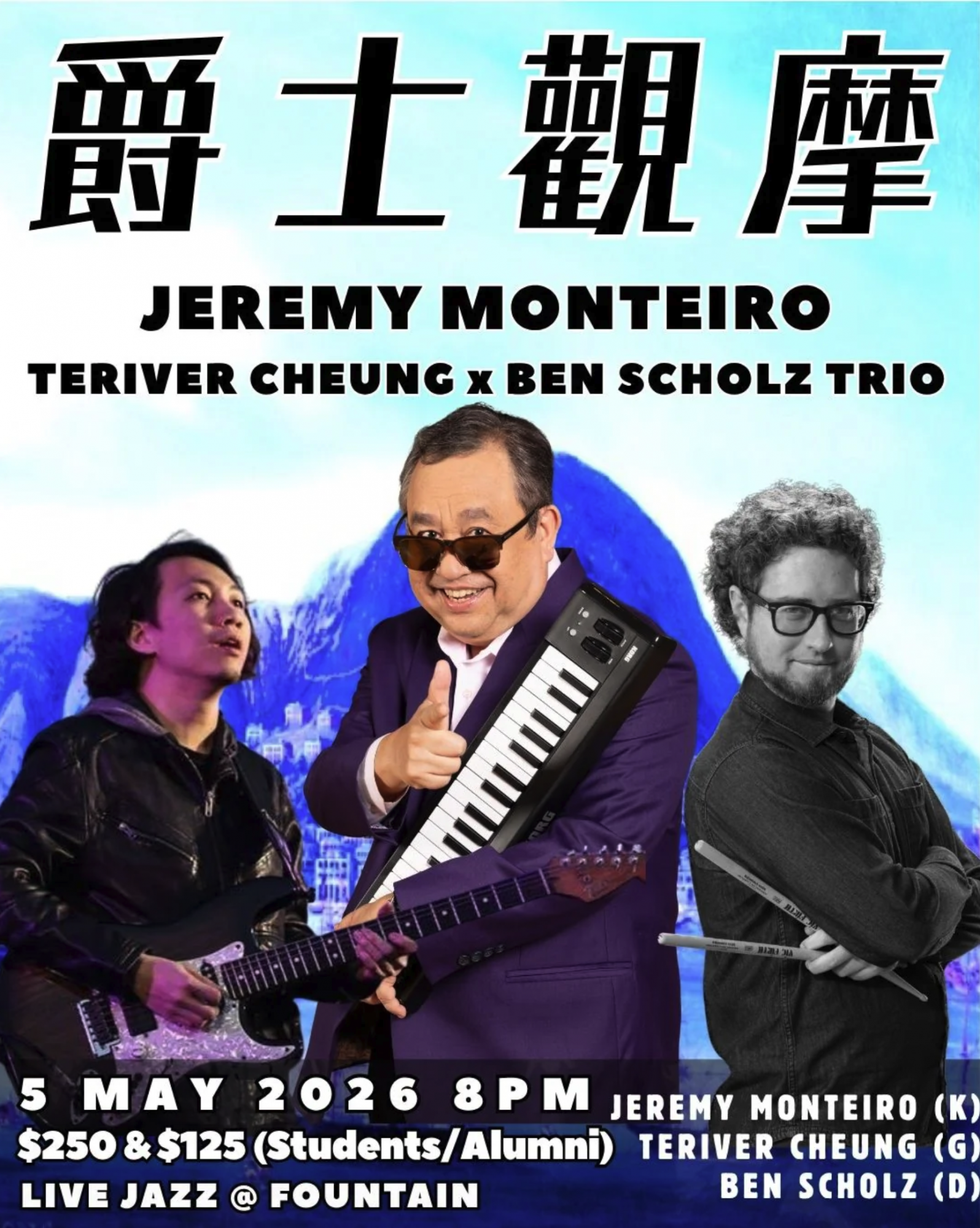 新加坡爵士泰斗 Jeremy Monteiro、香港結他手 張駿豪(Teriver Cheung),聯同美國鼓手 Ben Scholz,三位橫跨亞洲、美洲同歐洲嘅音樂家,將首次以三重奏形式喺 翻騰三周半(Fountain de Chopin) 同台演出,帶嚟爵士標準曲同原創作品。呢個組合同舞台本身已經好罕見,絕對值得樂迷留意