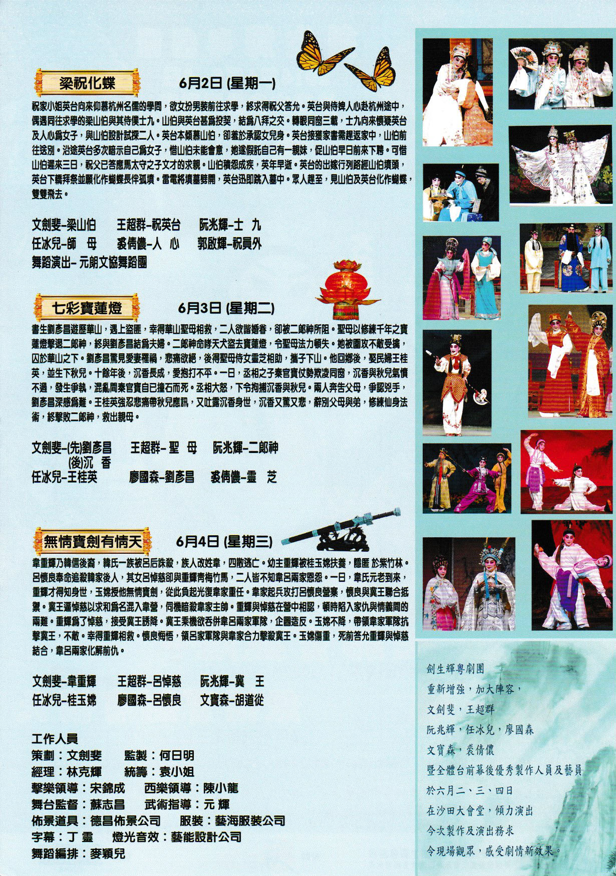 祝家小姐英台向來仰慕抗州名儒的學問,欲女扮男裝前往求學,終求得祝父答允。英台與侍婢人心赴抗州途中,偶遺同往求學的梁山伯與其侍僕士九。山伯與英台甚為投契,結為八拜之交,轉眼同自三載,士九向來懷疑英台及人心為女子,與山伯設計試探二人。英台本傾慕山伯,卻羞於承認女兒身。英台接獲家書需趕返家中,山伯前往送別。沿途英台多次暗示自己為女子,惜山伯未能會意,她遂假託自己有一親妹,促山伯早日前來下聘。可惜山伯遲來三日,祝父已答應馬太守之子文才的求親。山伯積怨成疾,英年早逝。英台的出嫁行列路經山伯墳頭,英台下轎拜祭並願化作蝴蝶長伴孤墳。雷電將墳墓劈開,英台迅即跳入墓中。眾人趕至,見山伯及英台化作蝴蝶,一雙雙飛去。