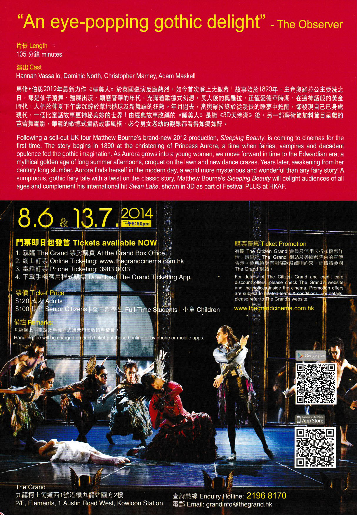 馬修•伯恩2012年最新力作《睡美人》於英國巡演反應熱烈,如今首次登上大銀幕!故事始於1890年,主角奧羅拉公主受洗之日,那是仙子飛舞、殭屍出沒、頹廢奢華的年代,充滿着歌德式幻想。長大後的奧羅拉,正值愛德華時期,在這神話般的黃金時代,人們於仲夏下午裏沉醉於草地槌球及新舞蹈的狂熱。年月過去,當奧羅拉終於從漫長的睡夢中甦醒,卻發現自己已身處現代,一個比童話故事更神秘美妙的世界!由經典故事改編的《睡美人》是繼《3D天鵝湖》後,另一部藝術節加料節目呈獻的芭蕾舞電影,華麗的歌德式童話故事風格,必令男女老幼的觀眾都看得如癡如醉。