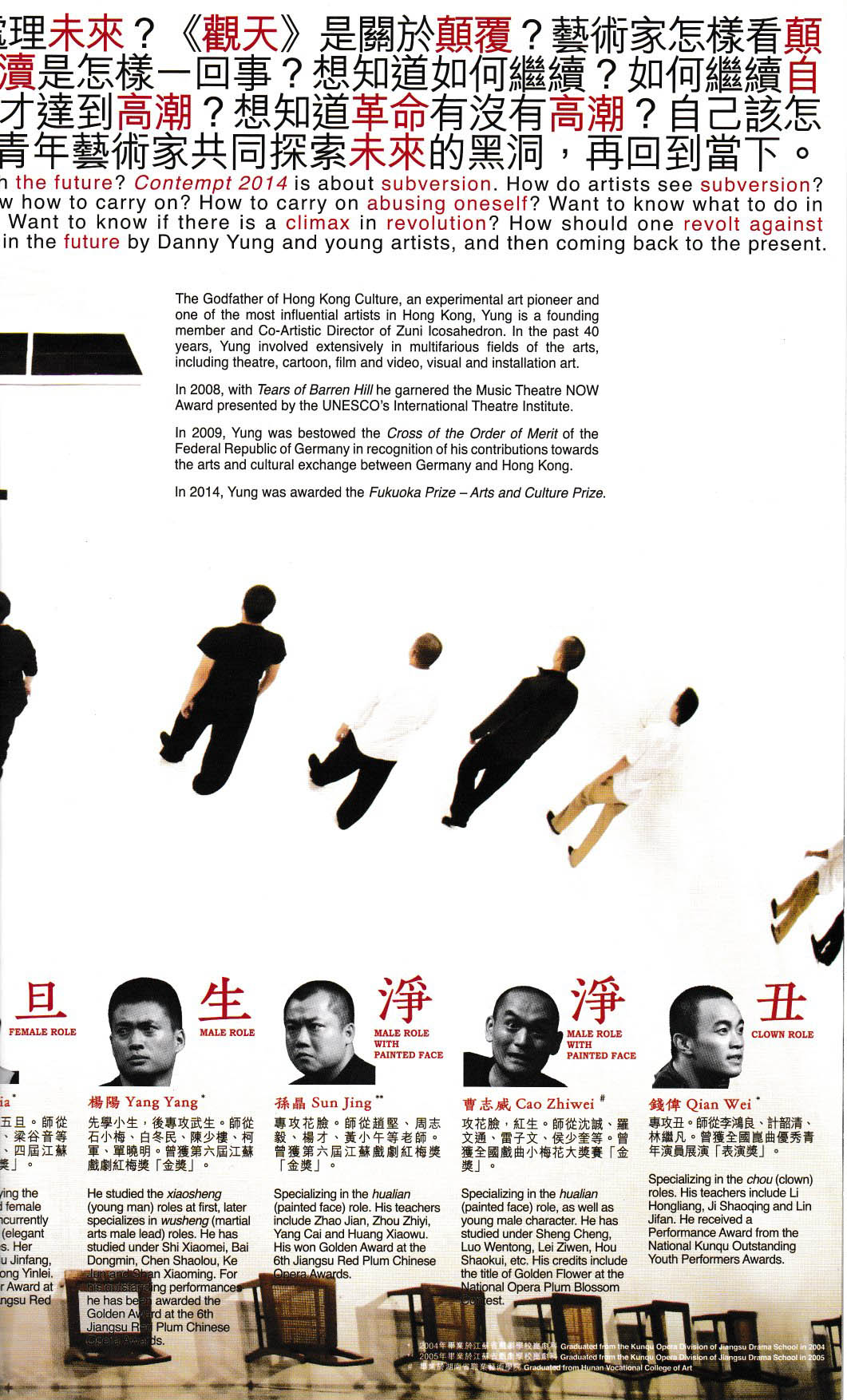 《觀天》是華人實驗藝術先驅榮念曾的最新製作,挑戰演員與觀眾、劇場與空間、藝術與社會之間的永恆命題。 「崑劇以及所有傳統表演藝術應當怎麼去保存和發展?是像展覽品一樣完封不動放在博物館裡供人欣賞,還是以知識去強化他們,讓他們重拾在大自然生存的本能?」— 榮念曾 九位曾獲多個獎項的江蘇省青年崑曲演員大膽破天荒,將各自關注的議題,融入劇場時空,發展成首次中國傳統與當代集體創作的劇場。