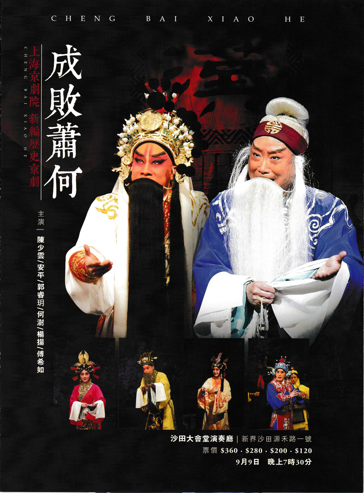 上海京劇院《成敗蕭何》是一部令人心弦震動的悲劇史詩,在業內及廣大戲迷心目中與《曹操與楊修》一併譽為“新時期歷史劇創作的雙子星座”。該劇由 麒派老生陳少雲與裘派花臉安平連袂主演,可謂爭強鬥狠、珠聯璧合。陳少雲先生作為當代麒派演員的領軍人物,其個人表演藝術已然爐火純青、進入化境。安平則是技能全面的淨角人才,架子銅錘兩門抱,尤其經過《成敗蕭何》的曆練,其唱腔與表演均更趨沉穩成熟。作為上海京劇院的獲獎“大滿貫”劇碼,先後獲得中國戲劇節優秀劇碼獎、中國京劇藝術節一等獎、中宣部“五個一工程獎”、文化部“文華大獎”、2008-2009年度國家舞臺藝術精品工程“十大精品劇碼”(榜首)、中國戲曲學會獎等國家級重要獎項。《成敗蕭何》秉承上海京劇院的一貫作風,精益求精、千錘百煉,自2004年誕生以來劇本幾易其稿,舞臺呈現幾度修改。“麒韻裘味”,是《成敗蕭何》作為京劇表演藝術舞臺呈現的兩大支撐,劇中不僅有流派唱腔的大集成,亦有充分發揮流派特色的新唱腔設計。縱觀本劇,不僅是對京劇流派藝術的傳承與發展,更展現了對經典與歷史的當代解讀,以厚重的底蘊、峻拔的品相和表演藝術的精彩精湛贏得了當代京劇觀眾的青睞。
