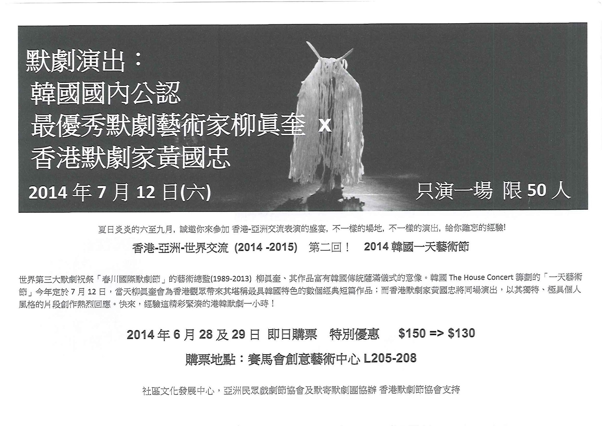 世界第三大默劇祝祭「春川國際默劇節」的藝術總監(1989-2013) 柳眞奎、其作品富有韓國傳統薩滿儀式的意像。韓國The House Concert籌劃的「一天藝術節」今年定於7月12日,當天柳眞奎會為香港觀眾帶來其堪稱最具韓國特色的數個經典短篇作品;而香港默劇家黃國忠將同場演出,以其獨特、極具個人風格的片段創作熱烈回應。快來,經驗這精彩緊湊的港韓默劇一小時!