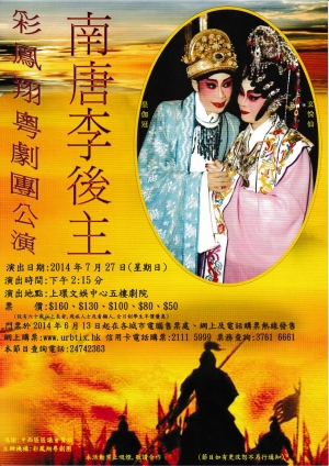 彩鳳翔粵劇團公演(南唐李後主)的六台柱名稱:皇伽冠、玄悅仙、陳金成、朱苔瑩、欣伽龍、鳴悅恩。