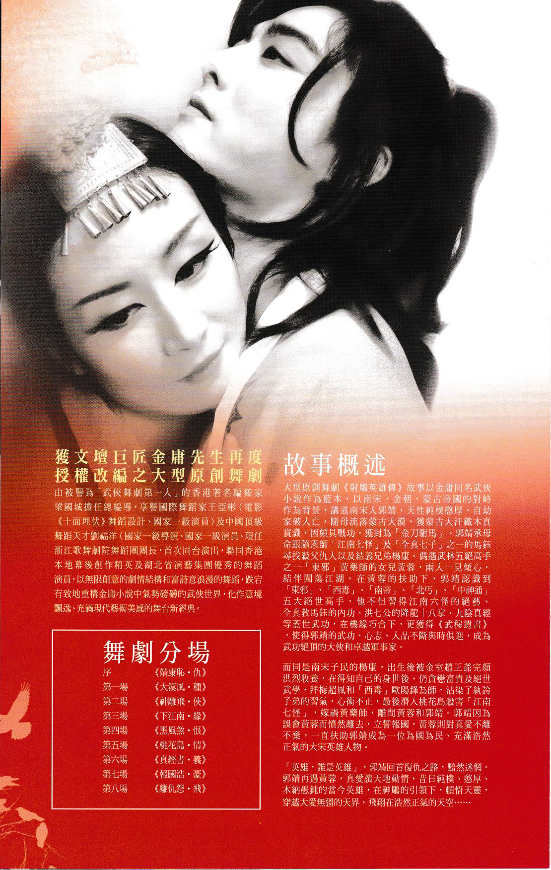 獲文壇巨匠金庸先生再度授權改編之大型原創舞劇《射鵰英雄傳》,由被譽為「武俠舞劇第一人」的香港著名編舞家 梁國城 擔任總編導,享譽國際舞蹈家 王亞彬(電影《十面埋伏》舞蹈設計、國家一級演員)及中國頂級舞蹈天才 劉福洋(國家一級導演、國家一級演員、現任浙江歌舞劇院舞蹈團團長),首次同台演出,聯同香港本地卓越的幕後創作精英及湖北省演藝集團優秀的舞蹈演員,以無限創意的劇情結構和富詩意浪漫的舞蹈,跌宕有致地重構金庸小說中氣勢磅礡的武俠世界,化作意境飄逸、充滿現代藝術美感的舞台作品。