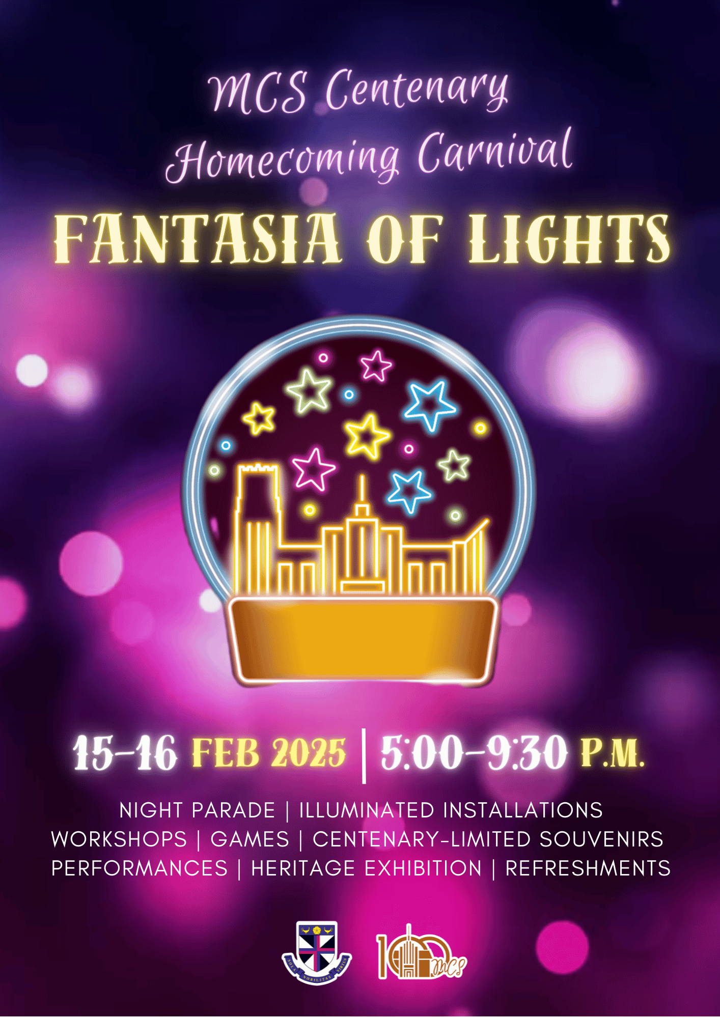 Dazzling lights will adorn the Maryknoll campus at the "Fantasia of Lights - MCS Centenary Homecoming Carnival". We welcome all family and friends of Maryknoll to come back for this first-ever night carnival in celebration of our School's 100th anniversary.