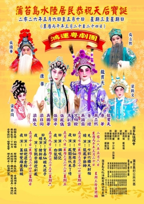 鴻運粵劇團 蒲苔島水陸居民恭祝天后寶誕|《七彩六國大封相》《龍鳳爭掛帥》《胡不歸》《鳳閣恩仇未了情》《獅吼記》《萬世流芳張玉喬》《賀壽仙姫大送子》《三笑姻緣》《春花笑六郎》《雙龍丹鳳霸皇都》《雷鳴金鼓戰笳聲》