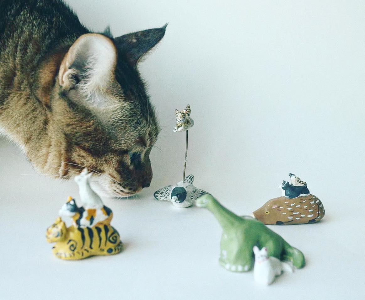 走近木格櫃前,這是一個需要湊近細觀的微型展覽,每隻手捏貓都有不一樣的神情和姿態,它們的熟睡姿態也是一種境界——當腦袋感覺安全,身體卸下戒心,皮膚放鬆,肌肉也變得柔軟~
