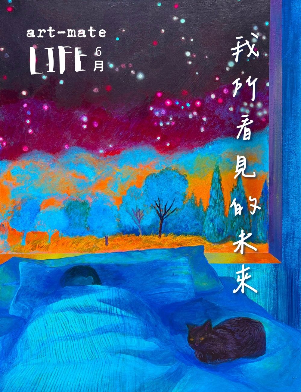 畫面以藍橘色調為主,描繪蜷縮於床的無性別人體,頭部深埋枕中,黑貓蜷臥床邊。窗外是我反覆塗改的風景——新界的橘色田野與藍色樹木交錯,夜空佈滿螢光星點,那些光點其實是社交媒體未讀訊息的殘影。一窗之隔,螢光色調模糊現實與夢境邊界,不是為了夢幻,而是呈現失眠時感官麻痺卻思緒紛雜的狀態,強調現代人與環境的疏離,窗口成為情感與外界的微妙接口。