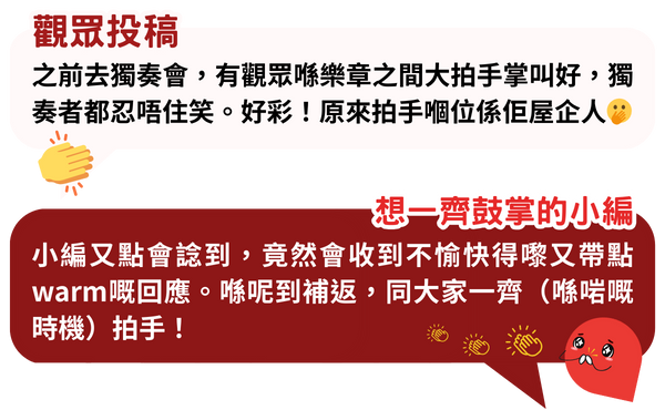 💬「其實做一個有質素嘅觀眾真係咁難咩?台上表演緊,唔該你哋尊重吓人哋安靜啲,以上種種行為都見過:有時因為交通,遲到入場都無可厚非,但唔好坐低就大大聲同朋友解釋點解遲到。扯鼻鼾同咳好難講,或者真係好攰瞓着覺,咳係控制唔到,佢都唔想。緊急要用電話,就較暗啲放低啲用手遮住,唔好影響人。飲清水我覺得可以,食嘢就唔得,有啲人摷嘢食,啲膠袋紙袋聲好嘈。最乞人憎就係傾偈、講電話、跟住唱!有啲人衰格到叫佢唔好講嘢唔好唱,仲俾佢鬧翻轉頭。仲有一種就係買平價位,到中場過後,走去前面坐。」