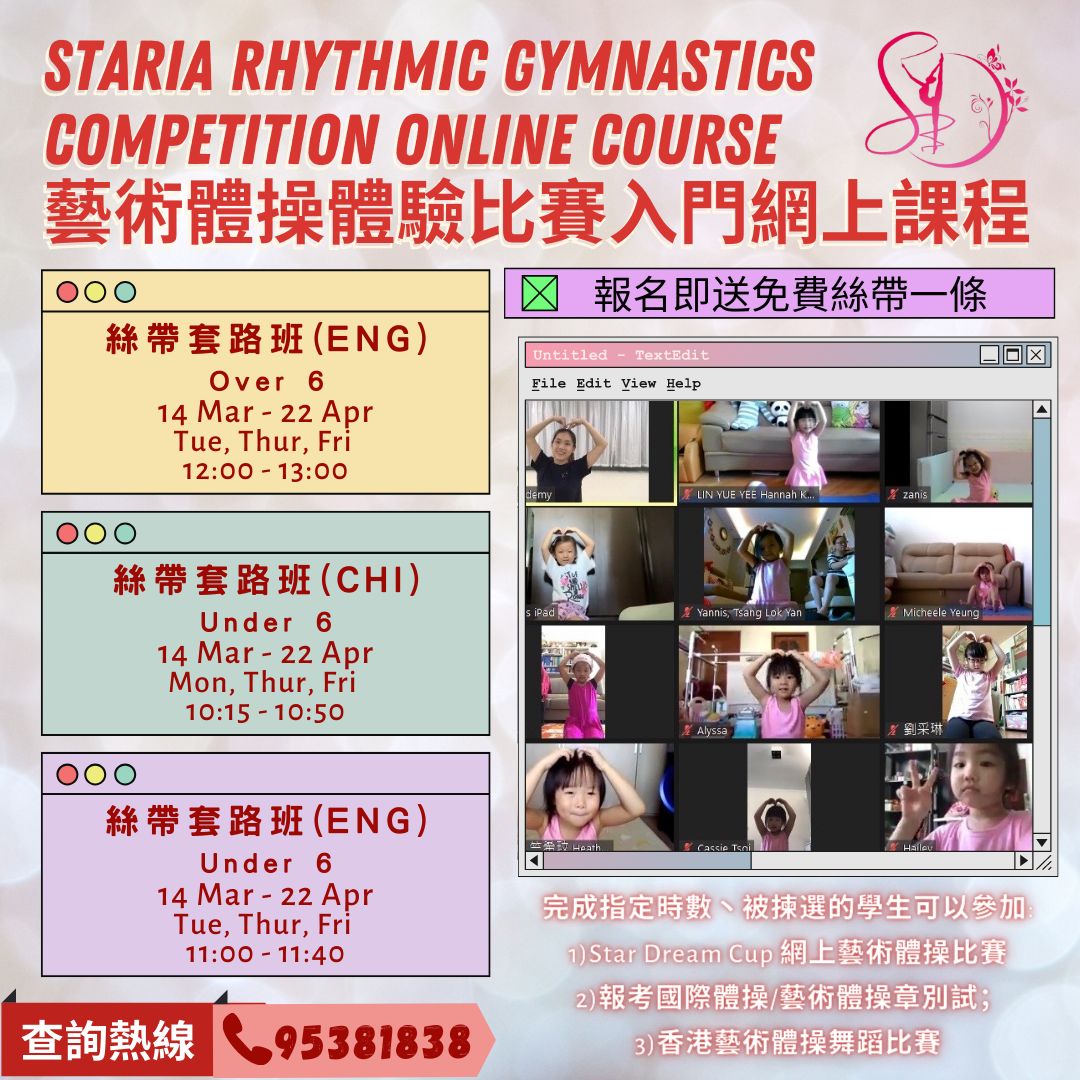 自兩年前推出短期Online 課程,一直以來深得各家長支持。小朋友透過短期 Online 課程,除了基本功大大提升,器械技巧亦明顯進步!小朋友自己有滿足感之餘,更學懂持之以恆,努力不放棄的精神!由於名額有限,上次錯過了Staria Girls或新生,今次不要錯過啦🥰
