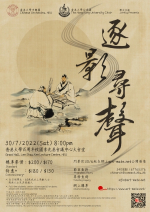 音樂會的主題是「逐影尋聲」,意指從多方面追求超脫的目標。儘管受疫情影響,我們分享音樂藝術的決心不改。港大中樂和港大合唱首次合作舉辦音樂會,旨在以中國傳統音樂傳播正能量、聚集音樂愛好者,並探索多元化的可能性。我們竭誠歡迎各方加入,一同享受音樂會帶來的樂趣。精選曲目:《夢宵醉》 謝基信 曲《遇雨(定風波)》 謝基信 曲《四川將軍令》 潘耀田 編曲 李庭耀改編揚琴《香港電影音樂組曲》黃學揚 編