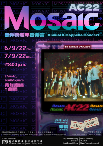 Mosaic無伴奏合唱週年音樂會是我們精心為大家而設的年度盛事,亦是我們每年最大型的製作。從籌劃工作、劇本撰寫、選曲編曲、宣傳出版,乃至在台上演出,均由每位Mosaic團員擔任。經過上年度的線上週年音樂會,我們更期待今年度為大家帶來豐富的表演,及終於能夠感受現場觀眾滿滿的能量!