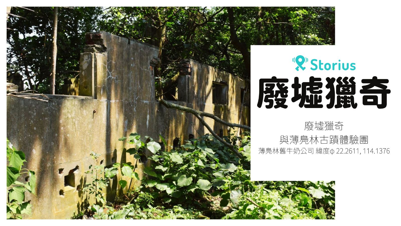 Storius導賞員同你一齊用Storius App遊歷薄扶林。從優雅到離奇的杜格拉斯堡走到香港第一個水塘,再從石屎地走到「唔係路」的牛奶公司牧場廢墟遺址進行輕度獵奇。購買了由城市當代舞蹈團主辦的光影裝置舞蹈劇場 《想見有時》活動,更可以完成體驗團後進場欣賞演出。