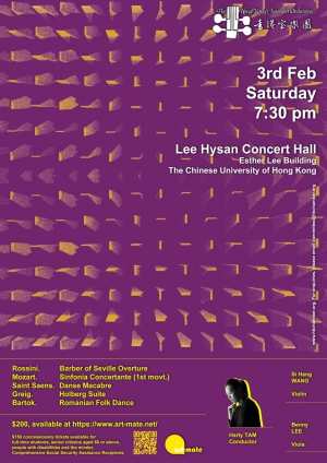 羅西尼 - 賽維爾理髮師序曲莫札特 - 降E大調交響協奏曲 K.364聖桑 - 骷髏之舞葛利格 - 霍爾堡組曲巴爾托克 - 羅馬尼亞民間舞曲歡迎追蹤我們的 Facebook 頁面:https://www.facebook.com/hkchamber/