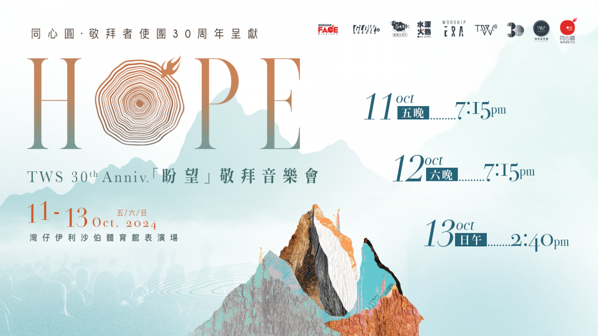 經過這30年的磨煉,我們衷心希望再次招聚香港敬拜者,一同向神獻上最大的讚美和感恩,一起盼望著生命再次被神改變和復興!同心圓·敬拜者使團30周年呈獻 - HOPE 盼望 敬拜音樂會11-13/10/2024 (星期五、六、日)星期五、六場 7:15pm星期日場 2:40pm灣仔伊利沙伯體育館表演場忍耐生老練、老練生盼望。在末後的世代裡,忍耐到底必得著生命的盼望!*聚會設培靈信息,歡迎攜同未信親友一同出席*